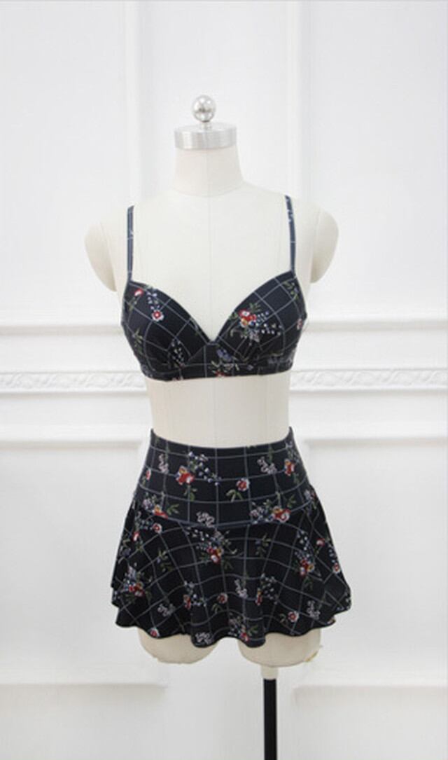 3点セット ビキニ 花柄 肩出し シフォントップス付 ハイウエスト ブラック