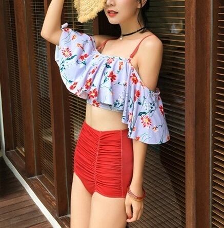 フレアオフショルダーハイウエストタンキニ ビキニ フラワープリント インスタ映え フォトジェニック セパレート 夏 海 かわいい 海水浴 ナイトプール
