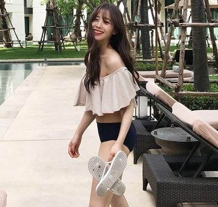 ビキニセット 2点セット ツーピース セパレート 無地 配色 バイカラー シンプル 上品 バストカバー フリル ハイウエスト ワンカラー オフショル トレンド 流行り オシャレ レディース インスタ映え フォトジェニック ナイトプール ビーチ プール 海 夏 海水浴