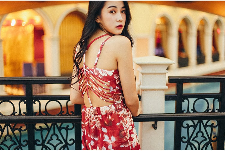 ビビッドレッドに大人っぽい花柄がかわいい水着です♪