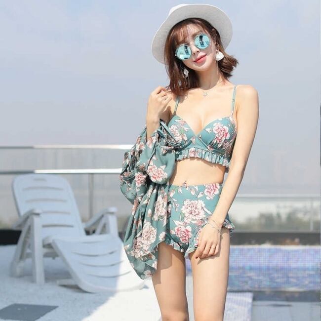 ビキニセット ワンピース 3点セット スリーピース カバーアップ フリル レトロ 花柄 フローラル 総柄 上品 クラシカル トレンド 流行り オシャレ レディース インスタ映え フォトジェニック ナイトプール ビーチ プール 海 夏 海水浴