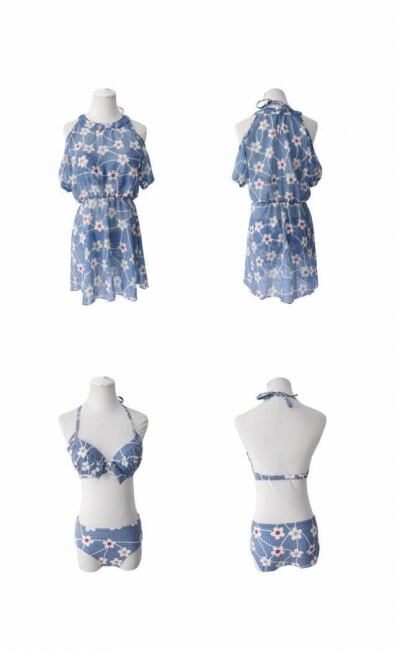 花柄を全面にあしらった清涼感のあるビキニとゆったりワンピのセット。