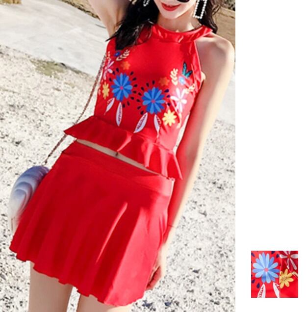 花柄ハイネックのタンキニ 後ろ姿がチャーミング 水着 情熱的なレッド フリル ビビット
