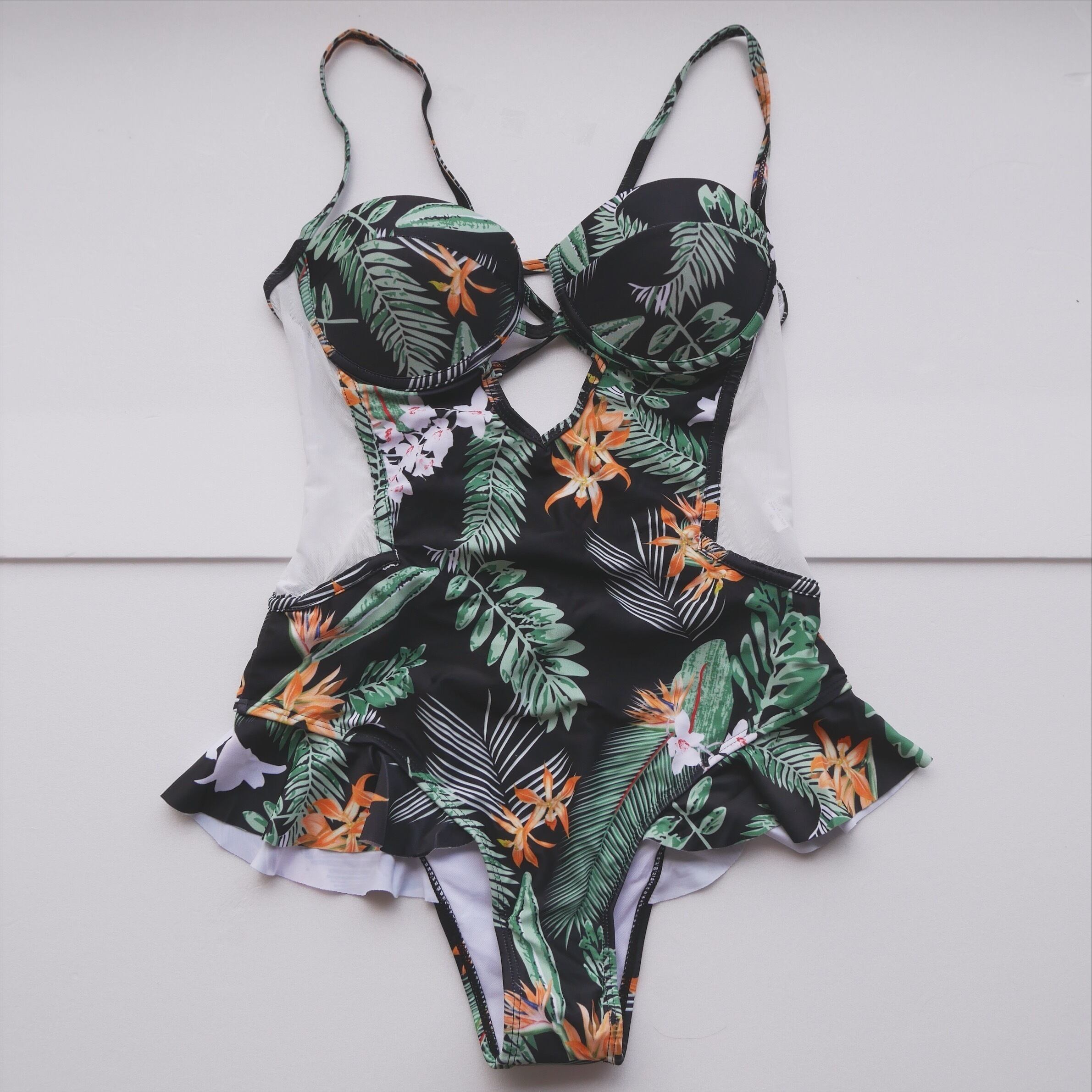 ボタニカル柄ワンピース水着 フリルデザイン シースルー インスタ映え フォトジェニック 夏 海 海水浴 ナイトプール