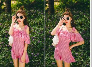 ワンピース水着 スイムウェア ビーチウェア 2点セット ツーピース ショートパンツ ストライプ フレア オフショル ミニ丈 ガーリー 大人可愛い トレンド 流行り オシャレ レディース インスタ映え フォトジェニック ナイトプール ビーチ プール 海 夏 海水浴