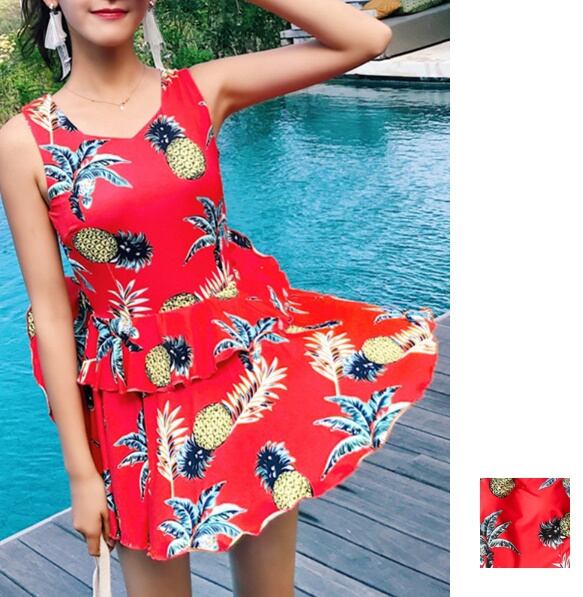 個性的なパイナップル柄の水着ワンピース 赤 トロピカル 背中開き トレンド ダブルクロスバック