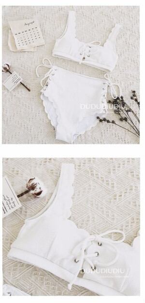 ビキニセット セパレート ツーピース 2点セット タンキニ スカラップ 無地 シンプル ワンカラー 大人キレイ 可愛い フェミニン 清涼感 レースアップ 編み上げ トレンド 流行り オシャレ レディース インスタ映え フォトジェニック ナイトプール ビーチ プール 海 夏 海水浴