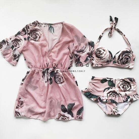 ビキニセット セパレート ツーピース 3点セット カバーワンピース カバーアップ ローズ 花柄 フローラル フリル エレガント 大人レディ 人気 ホルターネック トレンド 流行り オシャレ レディース インスタ映え フォトジェニック ナイトプール ビーチ プール 海 夏 海水浴