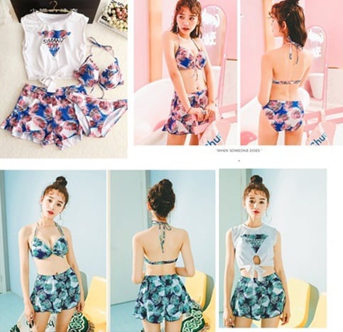 スカートスプリット水着 4点セット ボタニカル柄ビキニ ノースリーブトップ フリルパンツ ビキニ トレンド トロピカルカラー