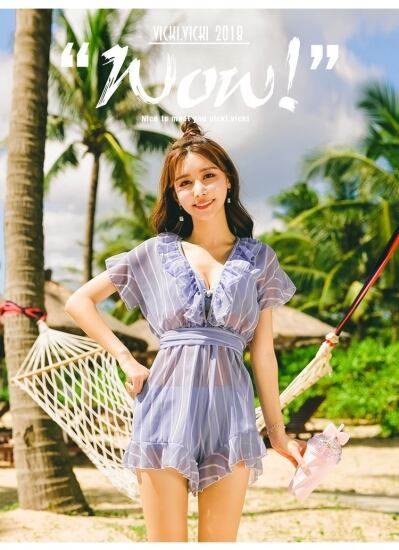 ビキニセット セパレート スリーピース 3点セット ストライプ シースルー オールインワン 透け感 フリル ホルターネック フェミニン 爽やか 清涼感 トレンド 流行り オシャレ レディース インスタ映え フォトジェニック ナイトプール ビーチ プール 海 夏 海水浴