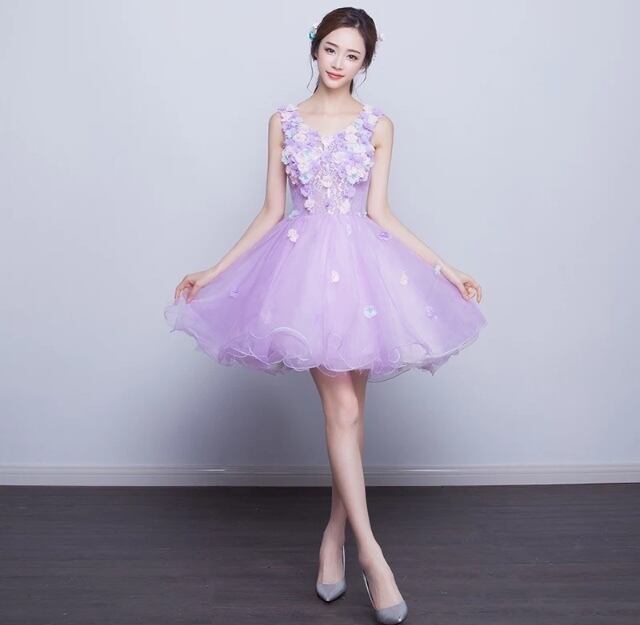 人と被りづらいパープル色のショート丈ドレス