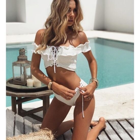 編み上げ フリル オフショルダー レースアップ 無地 シンプル エレガント リゾート 大人レディ ビキニセット セパレート ツーピース 2点セット トレンド 流行り オシャレ レディース インスタ映え フォトジェニック ナイトプール ビーチ プール 海 夏 海水浴