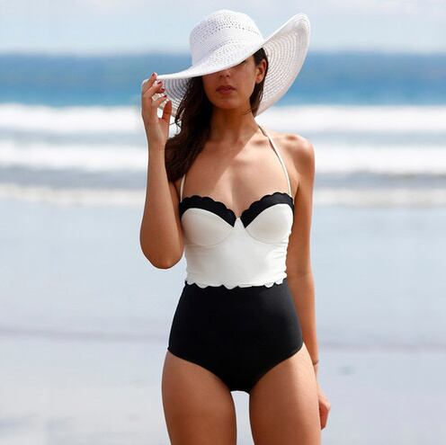 バイカラーワンピース水着 フリルがお洒落 シンプル 海 プール ビーチ セクシー ホルターネック