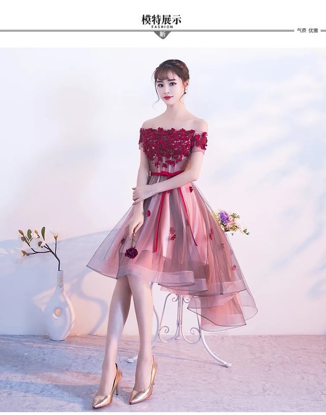 ワインレッド ガーリー フィッシュテールドレス 可愛い 綺麗 清楚 上品 花柄 リボン インスタ映え 女子会 パーティ お呼ばれ 結婚式 結婚式二次会 デート 記念日