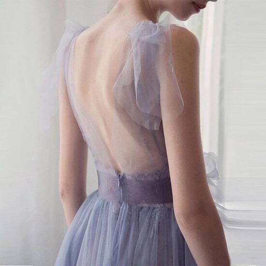 スモーキーカラーとデコルテ部分のデザインが大人っぽい◎