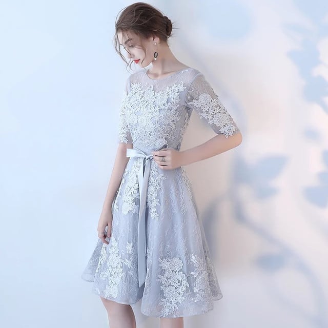 グレー レース ワンピース リボン シースルー 綺麗 可愛い 上品 清楚 おしゃれ お呼ばれ パーティ 結婚式 結婚式二次会 デート 記念日 インスタ映え