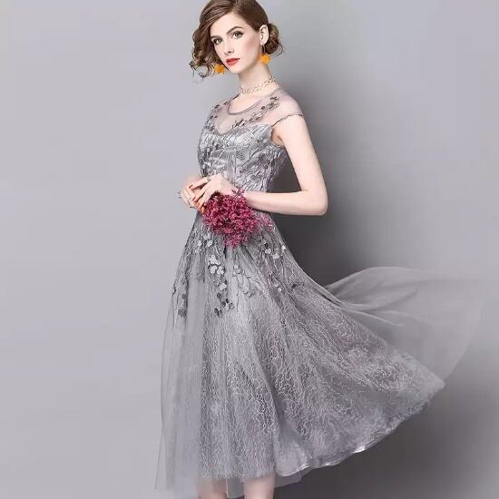 パーティードレス ひざ丈 ワンピース グレー 花柄刺繍 レース 透け感 シースルー チュール エアリー サテン 大人 上品 エレガント 結婚式二次会 お呼ばれ 2018年新作 婚活パーティー フォーマルドレス 披露宴 結婚式ドレス ウェディング