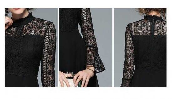 パーティードレス ひざ丈 ワンピース ブラック レース シック シフォン 長袖 プチハイネック フェミニン シースルー 大人 上品 デート 結婚式二次会 お呼ばれ 2018年新作 婚活パーティー フォーマルドレス 披露宴 結婚式ドレス ウェディング