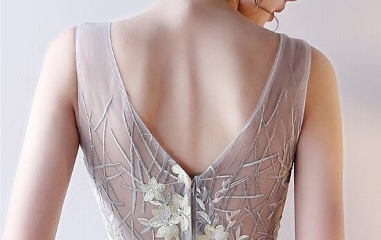 パーティードレス ひざ丈 ワンピース ノースリーブ シースルー 花柄刺繍 フィッシュテール グレー 大人 上品 可愛い セクシー 清楚 結婚式二次会 お呼ばれ 2018年新作 婚活パーティー フォーマルドレス 披露宴 結婚式ドレス ウェディング 謝恩会