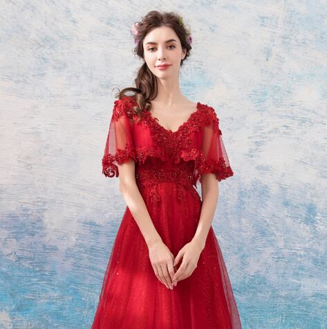 ロングドレス フレア袖 レース 刺繍 Vネック オーガンジー チュール ボレロ風 エレガント ボルドー 結婚式二次会 お呼ばれ 2018年新作 婚活パーティー フォーマルドレス 披露宴 結婚式ドレス ウェディング