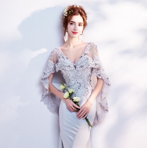 イブニングドレス ケープ風 刺繍 スパンコール マーメイド カットスリーブ シースルー 透け感 エレガント 結婚式二次会 お呼ばれ 2018年新作 婚活パーティー フォーマルドレス 披露宴 結婚式ドレス ウェディング 演奏会
