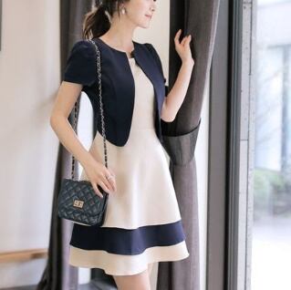 ショート丈のノーカラージャケットを羽織っているような、バイカラー配色がおしゃれなドッキングデザインのミニ丈フレアワンピースです。