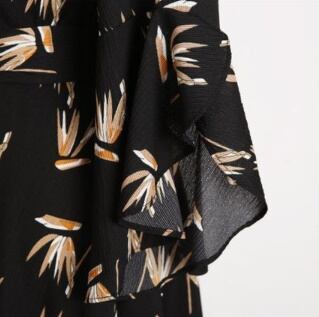 プリントワンピース ミディ丈 袖フレアー 入学式 卒業式 通勤 トレンド フェミニン エレガント フリル 結婚式二次会 お呼ばれ 2018年新作 婚活パーティー フォーマルドレス 披露宴 謝恩会 演奏会