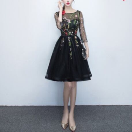 パーティードレス オーガンジードレス 花柄 刺繍 ジッパー ショート丈 ブラック 七分袖 大人可愛い Aライン 結婚式二次会 お呼ばれ 2018年新作 婚活パーティー フォーマルドレス 披露宴 結婚式ドレス ウェディング 謝恩会 入学式 演奏会
