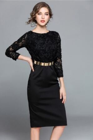 花柄レースデザインとメタリックなベルトがエレガントなパーティードレスです。