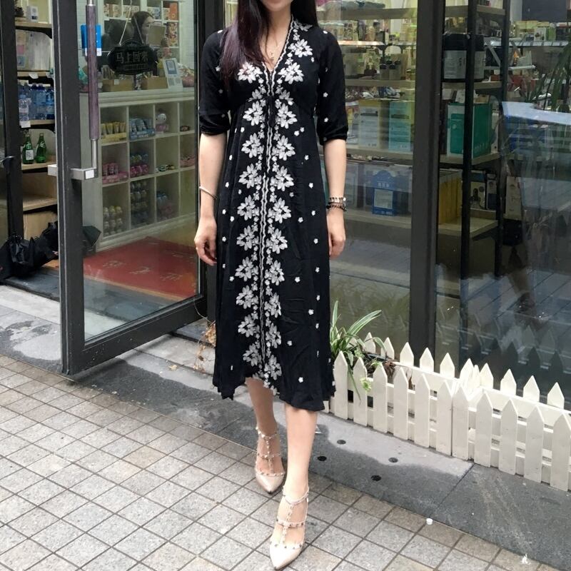縦のラインにあしらった花柄がアクセントになったワンピースです☆