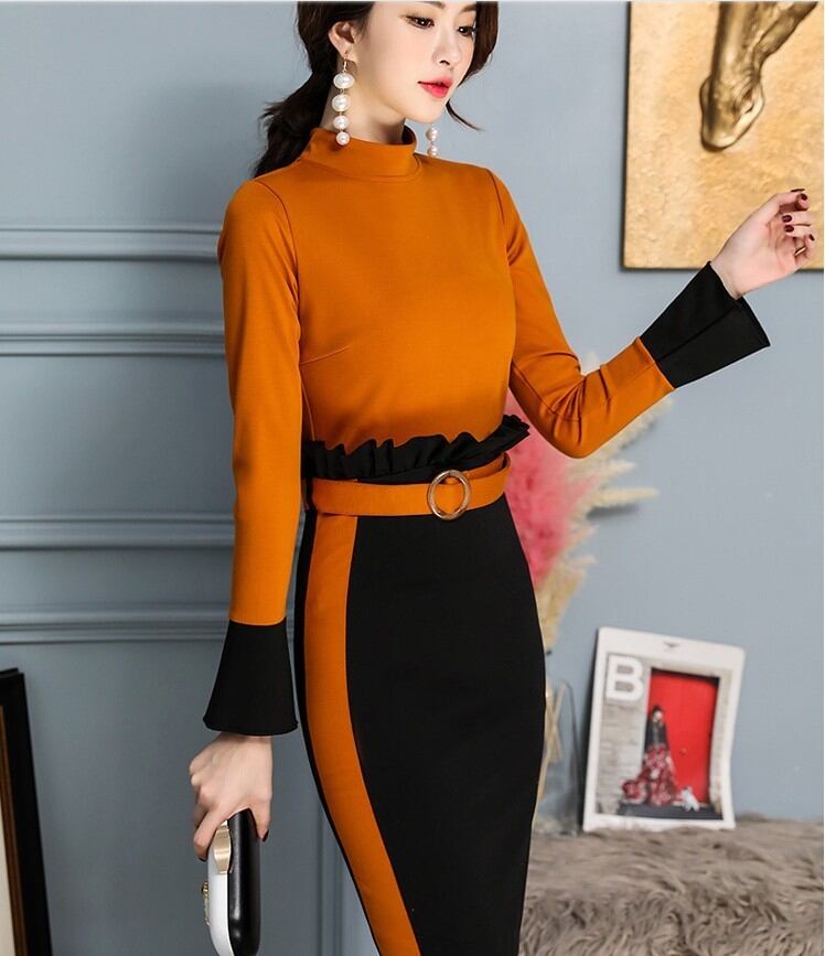 バイカラー 配色 タイトワンピース ハイネック フリル ウエストベルト エレガント ひざ丈 レディース 2018年新作 定番 人気 およばれ 結婚式 二次会 演奏会 観劇 謝恩会 発表会 パーティー ドレス