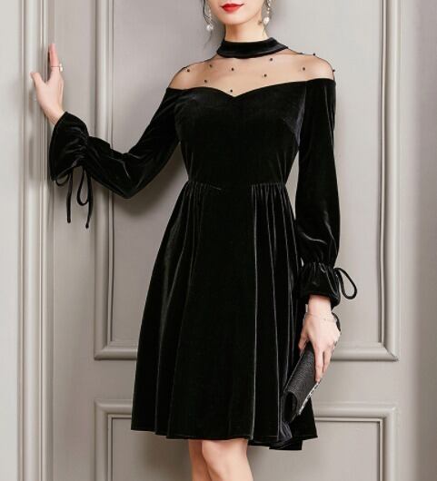 ベロアワンピース メッシュ ビーズ フレア ブラック 膝丈 ハイネック リボン Aライン 透け感 可愛い フェミニン パーティードレス 結婚式 二次会 お呼ばれ ワンピース フォーマル 2018年新作 婚活パーティー 披露宴 ウェディング 謝恩会 入学式 演奏会