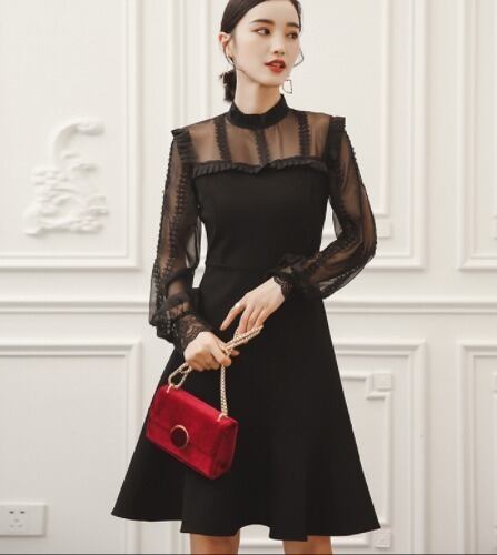 パーティードレス ハイネック 長袖 膝上丈 ミニ丈 レース チュール 透け感 ブラック 大人可愛い パーティー 結婚式 二次会 お呼ばれ ワンピース フォーマル 2018年新作 婚活パーティー 披露宴 ウェディング 謝恩会 入学式 演奏会