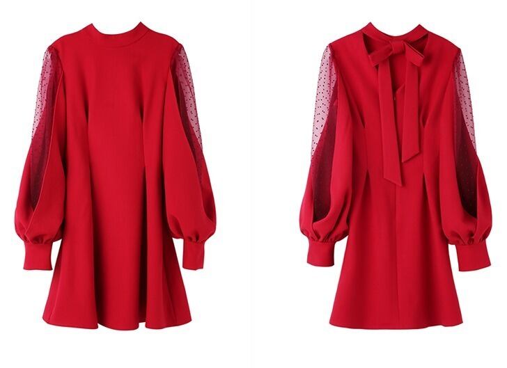 パーティードレス 3色 ドット メッシュステッチ 長袖 ランタンスリーブドレス ミニ丈 ハイネック リボン 可愛い パーティー 結婚式 二次会 お呼ばれ ワンピース フォーマル 2018年新作 婚活パーティー 披露宴 ウェディング 謝恩会 入学式 演奏会