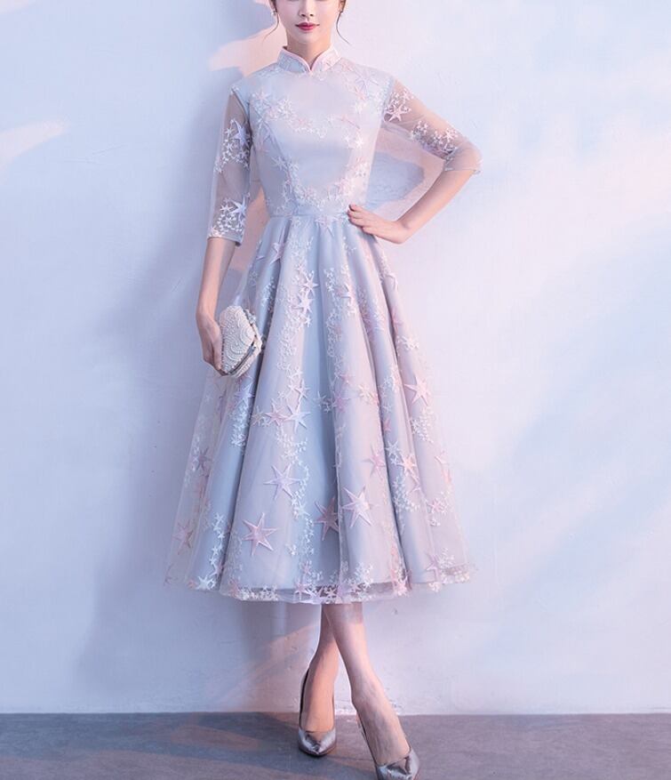 パーティードレス ハイネック 七分袖 星柄 ミモレ丈 Aライン チュール シースルー フェミニン 可愛い パーティー 結婚式 二次会 お呼ばれ ワンピース フォーマル 2018年新作 婚活パーティー 披露宴 ウェディング 謝恩会 入学式 演奏会