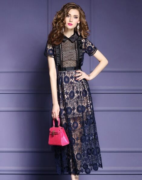 パーティードレス 花柄 レース 半袖 ロング 透け感 異素材ミックス ウエスト切替え 襟付き エレガント パーティー 結婚式 二次会 お呼ばれ ワンピース フォーマル 2018年新作 婚活パーティー 披露宴 ウェディング 謝恩会 入学式 演奏会