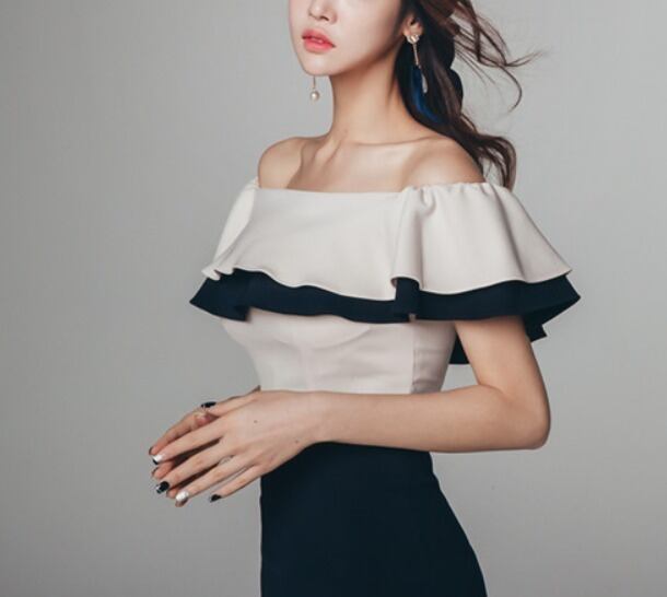 パーティードレス バイカラー オフショルダー フリル タイト スリム 無地 ミディ丈 おしゃれ フェミニン パーティー 結婚式 二次会 お呼ばれ ワンピース フォーマル 2018年新作 婚活パーティー 披露宴 ウェディング 謝恩会 入学式