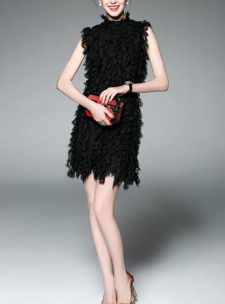 パーティードレス レース ノースリーブ スリムワンピース ミニ丈 タイト フリンジ ハイネック ふわふわ エレガント パーティー 結婚式 二次会 お呼ばれ ワンピース フォーマル 2018年新作 婚活パーティー 披露宴 ウェディング 謝恩会 入学式 演奏会