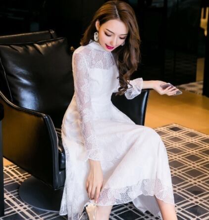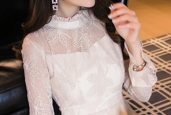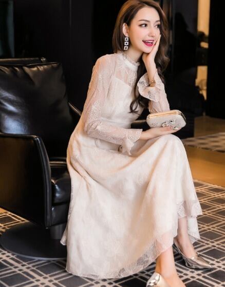 パーティードレス 3色 フレア レース ミモレ丈 ハイネック 長袖 Aライン エレガント フェミニン パーティー 結婚式 二次会 お呼ばれ ワンピース フォーマル 2018年新作 婚活パーティー 披露宴 ウェディング 謝恩会 入学式 演奏会