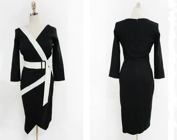 Vネック ウエストベルト ミディアムタイトドレス バイカラー ベルト 配色 モノカラー ライン シンプル 上品 レディース 2018年新作 定番 人気 およばれ 結婚式 二次会 演奏会 観劇 謝恩会 発表会 パーティー ドレス