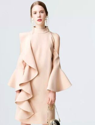 ピンクベージュ オープンショルダー フリルライン ハイネック フレア ミニドレス 膝上丈 ミニ丈 ボリューム袖 無地 パーティー 結婚式 二次会 お呼ばれ ワンピース フォーマル 2018年新作 婚活パーティー 披露宴 ウェディング 演奏会