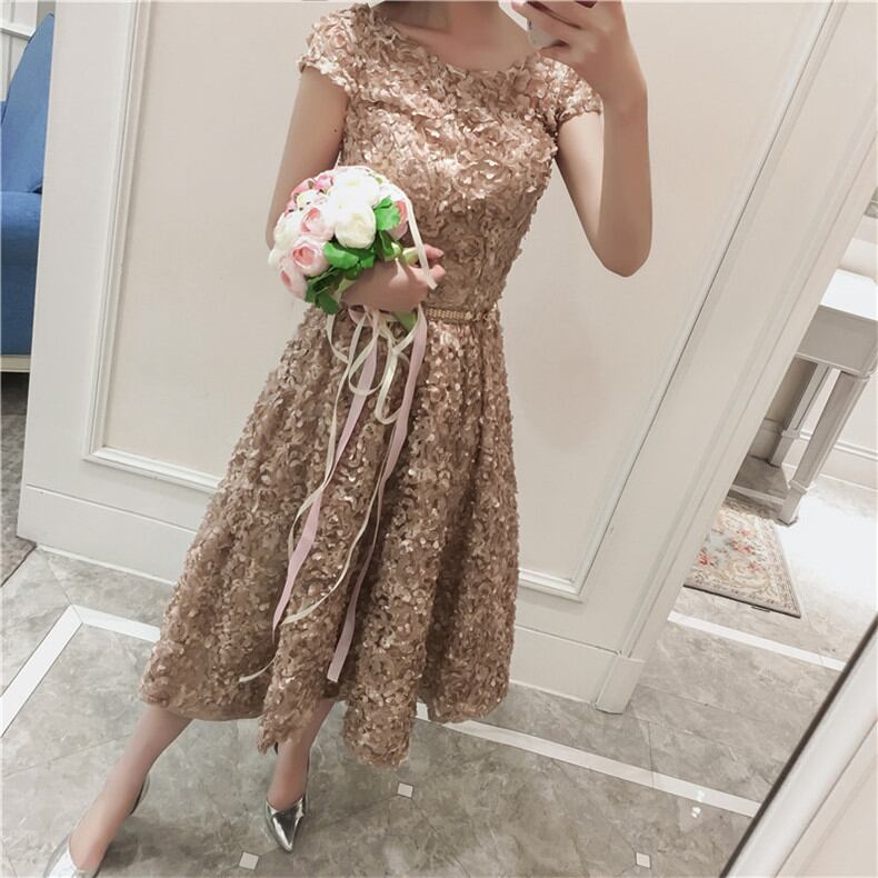 ハイウエスト 花びらデザイン エレガント ミディアムフレアドレス ゴールド パーティドレス 華やか ゴージャス ワンカラー エレガント 上品 レディース 2018年新作 定番 人気 およばれ 結婚式 二次会 演奏会 観劇 謝恩会 発表会 パーティー ドレス