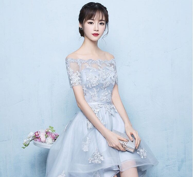 オフショル チュール フレア フィッシュテール シルバー パーティドレス ハイウエスト テール エレガント フェミニン 上品 レディース 2018年新作 定番 人気 およばれ 結婚式 二次会 演奏会 観劇 謝恩会 発表会 パーティー ドレス