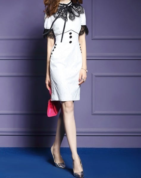 パーティードレス 花柄 レース 半袖 ドット 水玉 リボン 飾りボタン バイカラー ミニ丈 タイト 異素材ミックス フェミニン パーティー 結婚式 二次会 お呼ばれ ワンピース フォーマル 2018年新作 婚活パーティー 披露宴 ウェディング 謝恩会 入学式