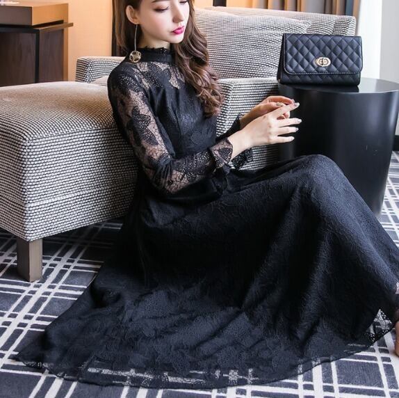 パーティードレス 3色 フレア レース ミモレ丈 ハイネック 長袖 Aライン 無地 エレガント フェミニン パーティー 結婚式 二次会 お呼ばれ ワンピース フォーマル 2018年新作 婚活パーティー 披露宴 ウェディング 謝恩会 入学式 演奏会