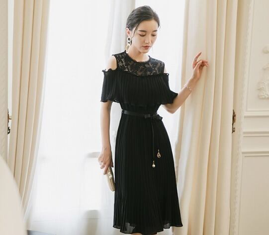 パーティードレス プリーツ レース シフォン 半袖 オープンショルダー ラウンドネック フリル 膝丈 ミディ丈 Aライン ビジュー付きウエストリボン ベルト エレガント フェミニン パーティー 結婚式 二次会 お呼ばれ ワンピース フォーマル 2018年新作 婚活パーティー 披露宴 ウェディング 謝恩会 入学式 演奏会