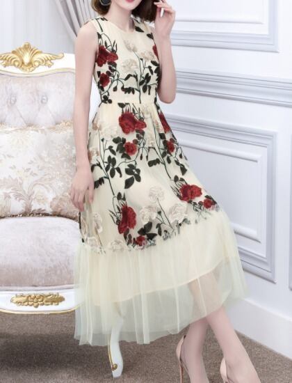 パーティードレス 花柄 刺繍 フリル ラウンドネック チュール ノースリーブ ミモレ丈 Aライン フレア エレガント フェミニン パーティー 結婚式 二次会 お呼ばれ ワンピース フォーマル 2018年新作 婚活パーティー 披露宴 ウェディング 謝恩会 入学式 演奏会