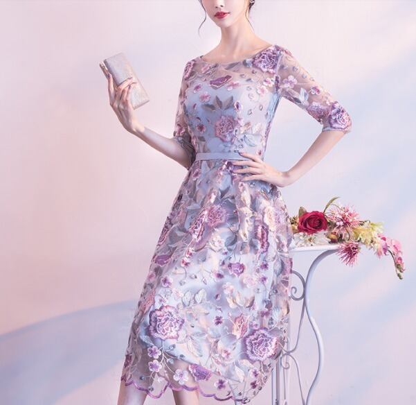 パーティードレス 花柄 刺繍 ボートネック 七分袖 Aライン ミモレ丈 膝下丈 チュール スカラップ フェミニン エレガント パーティー 結婚式 二次会 お呼ばれ ワンピース フォーマル 2018年新作 婚活パーティー 披露宴 ウェディング 謝恩会 入学式 演奏会