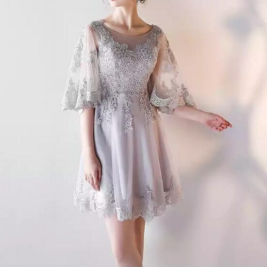 パーティードレス レース 花柄 フレアスリーブ 七分袖 フレア Aライン ショート ミニ丈 透け感 無地 可愛い エレガント パーティー 女子会 結婚式 二次会 お呼ばれ ワンピース フォーマル 2018年新作 婚活パーティー 披露宴 ブライダル 演奏会