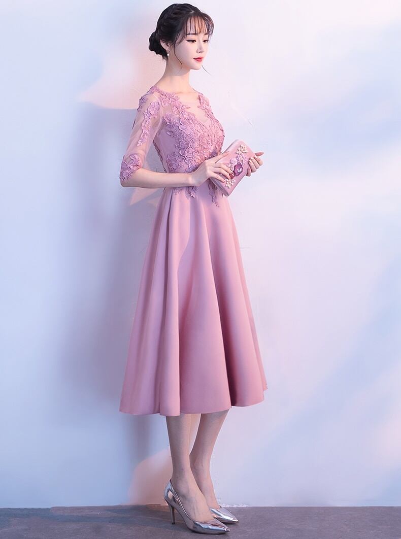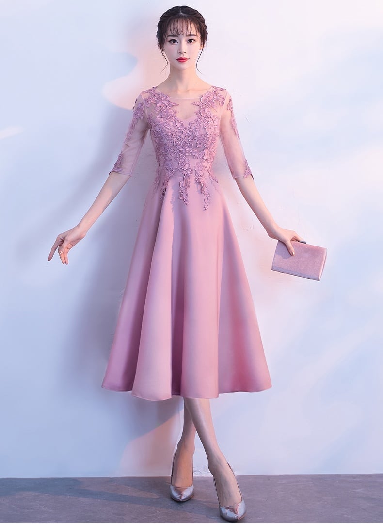 パーティードレス 花柄 レース 刺繍 透け感 五分袖 ミモレ丈 膝下丈 フレア Aライン Uネック フェミニン エレガント パーティー 女子会 結婚式 二次会 お呼ばれ ワンピース フォーマル 2018年新作 婚活パーティー 披露宴 ウェディング 演奏会